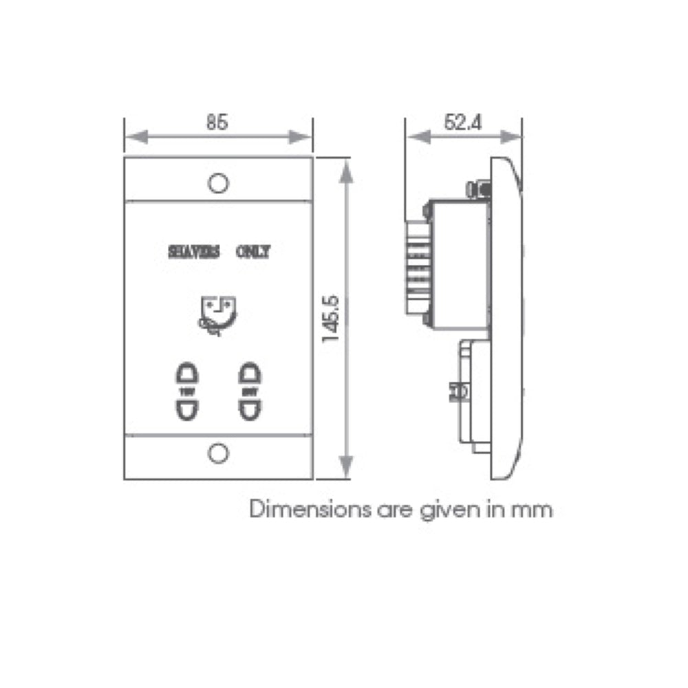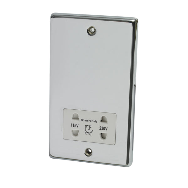 The Dual Voltage shaver socket is available with a choice of either a chrome or white finish. It is suitable to be used in bathrooms as it matches required wiring regulations. The chrome plated finish has a sloped edge, whilst the white finish has square edges.