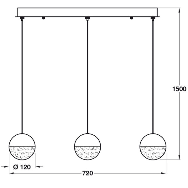 It features a rectangular ceiling bar with thin suspension wires holding 3 globe shaped shades.