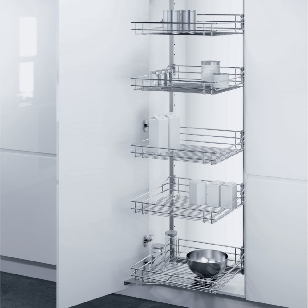 The VSA Swing Out Larder Units are easy to use; the baskets are pulled out of the cabinet at the same time as the door is opened. Baskets can be individually positioned at the required height in the cabinet frame.